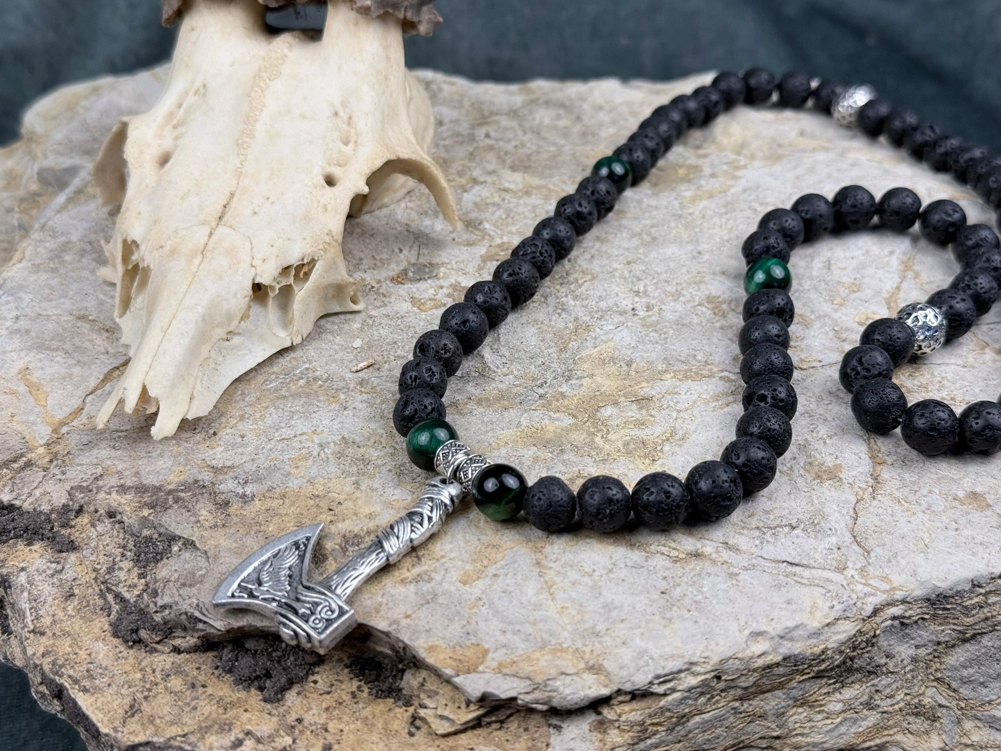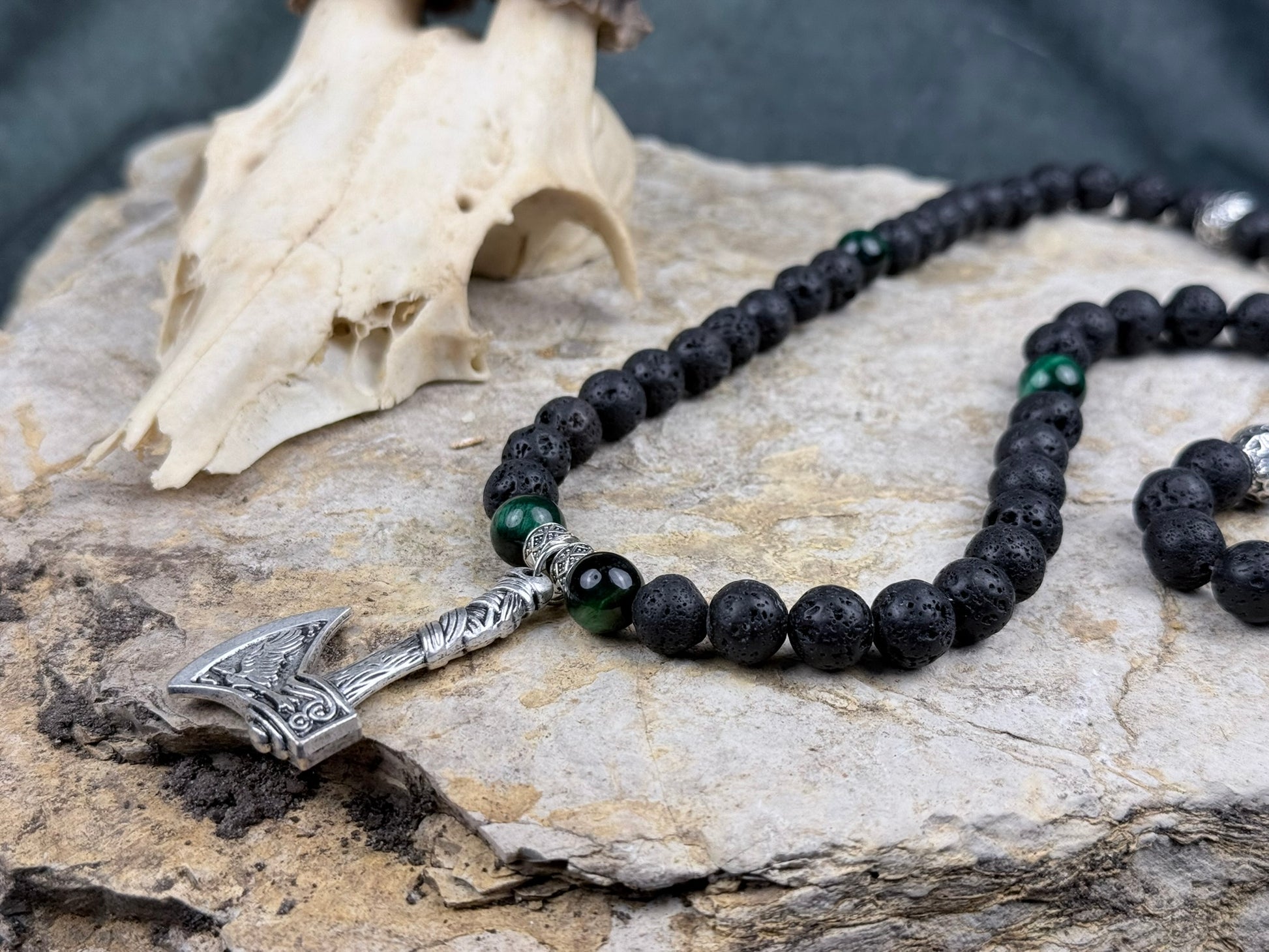 Die mattschwarzen Lavaperlen besitzen eine natürliche, poröse Struktur, die an erkaltete Vulkangesteine erinnert. Das grüne Tigerauge setzt leuchtende Akzente: mal dunkel wie Tannenschattierungen, mal schimmernd wie nasses Moos im Abendlicht. Der Axtanhänger rundet das Design ab – fein gestaltet, leicht antik, und dennoch robust genug, um als zentrales Highlight zu wirken.