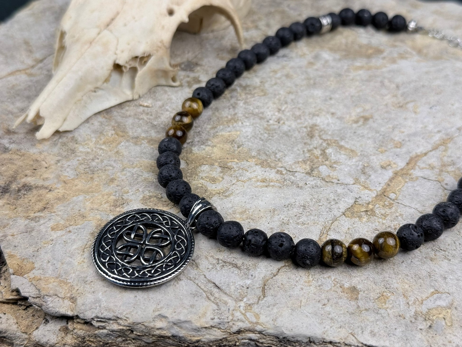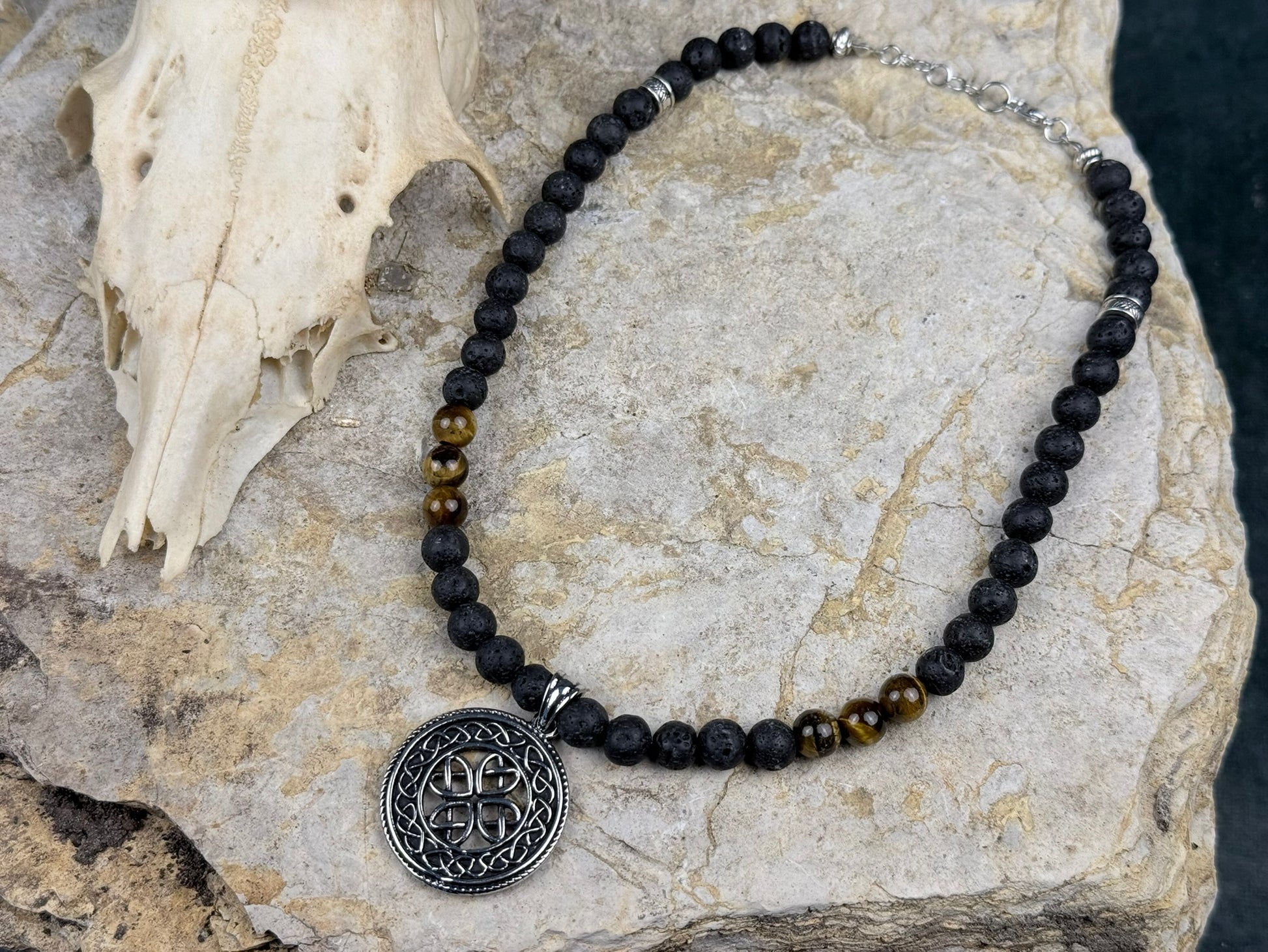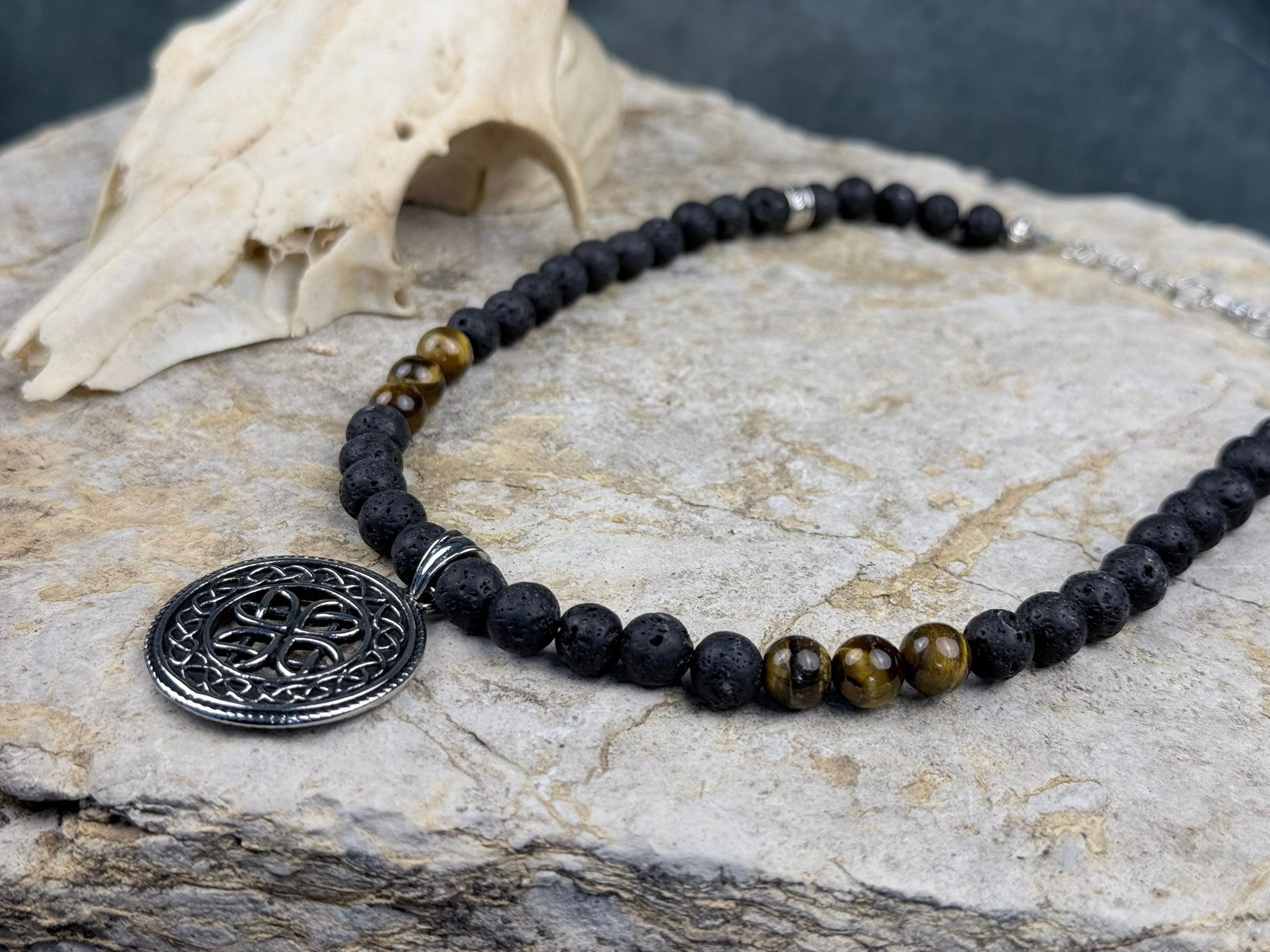 Flammenstein & Dunkelpfad – Halskette mit Lavastein, Tigerauge & keltischem Anhänger