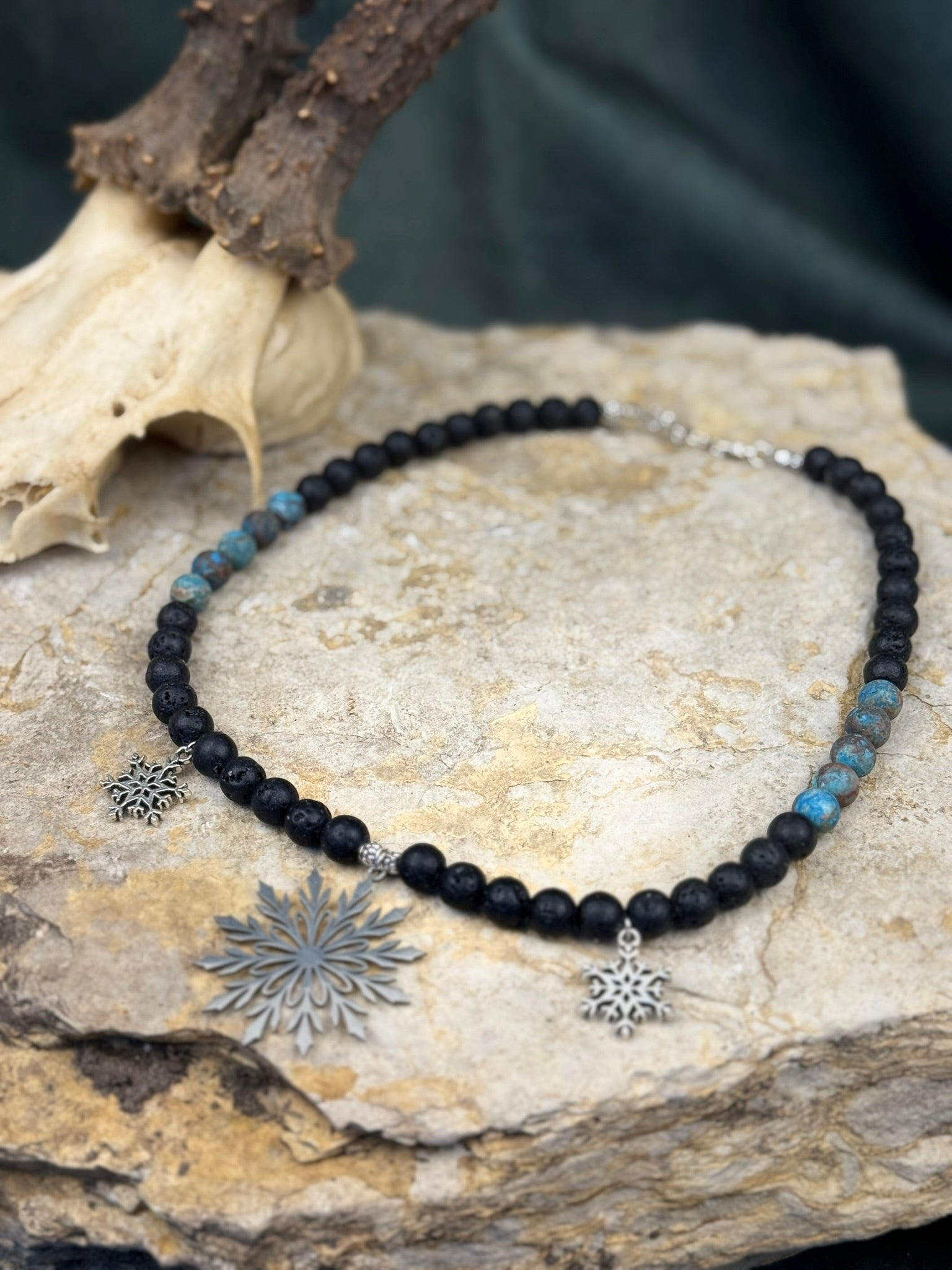 Dieses Schmuckstück trägt die Ruhe gefrorener Nächte, knirschenden Schnee und die klare Stille alter Winterlandschaften in sich. Die Kette verbindet tiefschwarzen Lavastein mit kühlen, blau schimmernden Akzentsteinen und fein gearbeiteten Eisstern-Amuletten – ein Zusammenspiel aus Ursprünglichkeit, Kälte und stiller Kraft.
