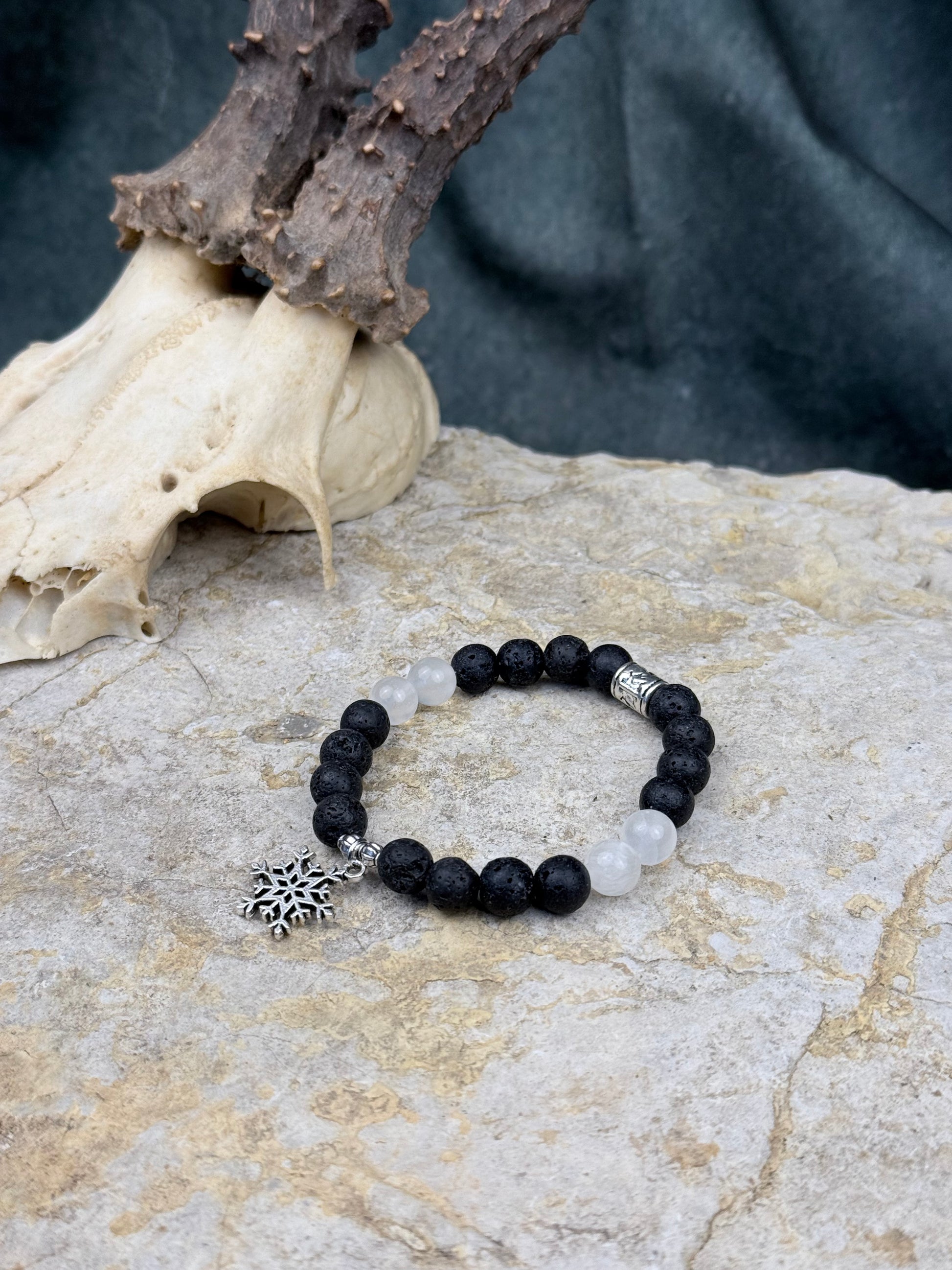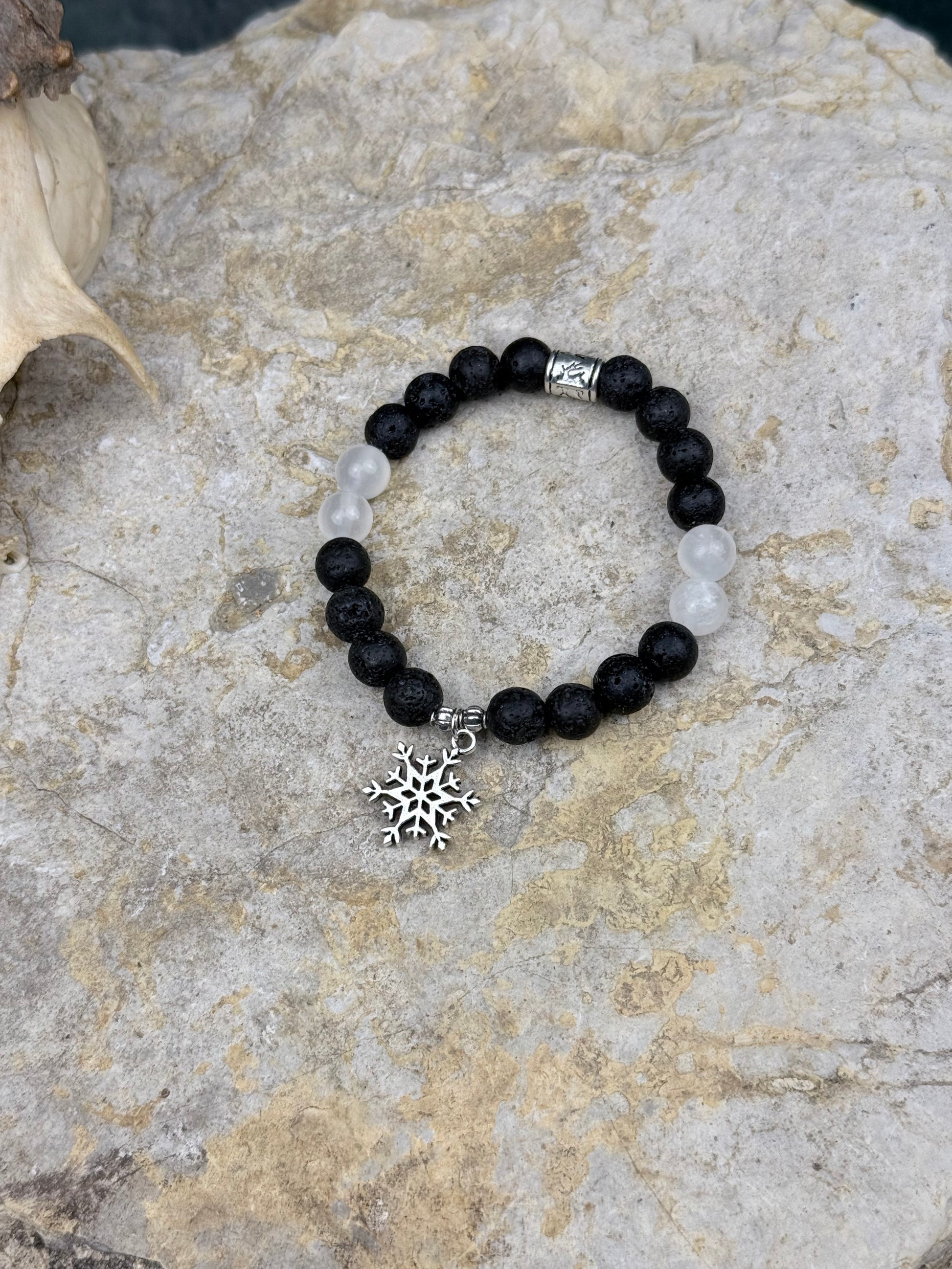 Frostodem der Mondhexe – Lavasteinarmband mit Schneequarz & Schneeflocken-Talisman