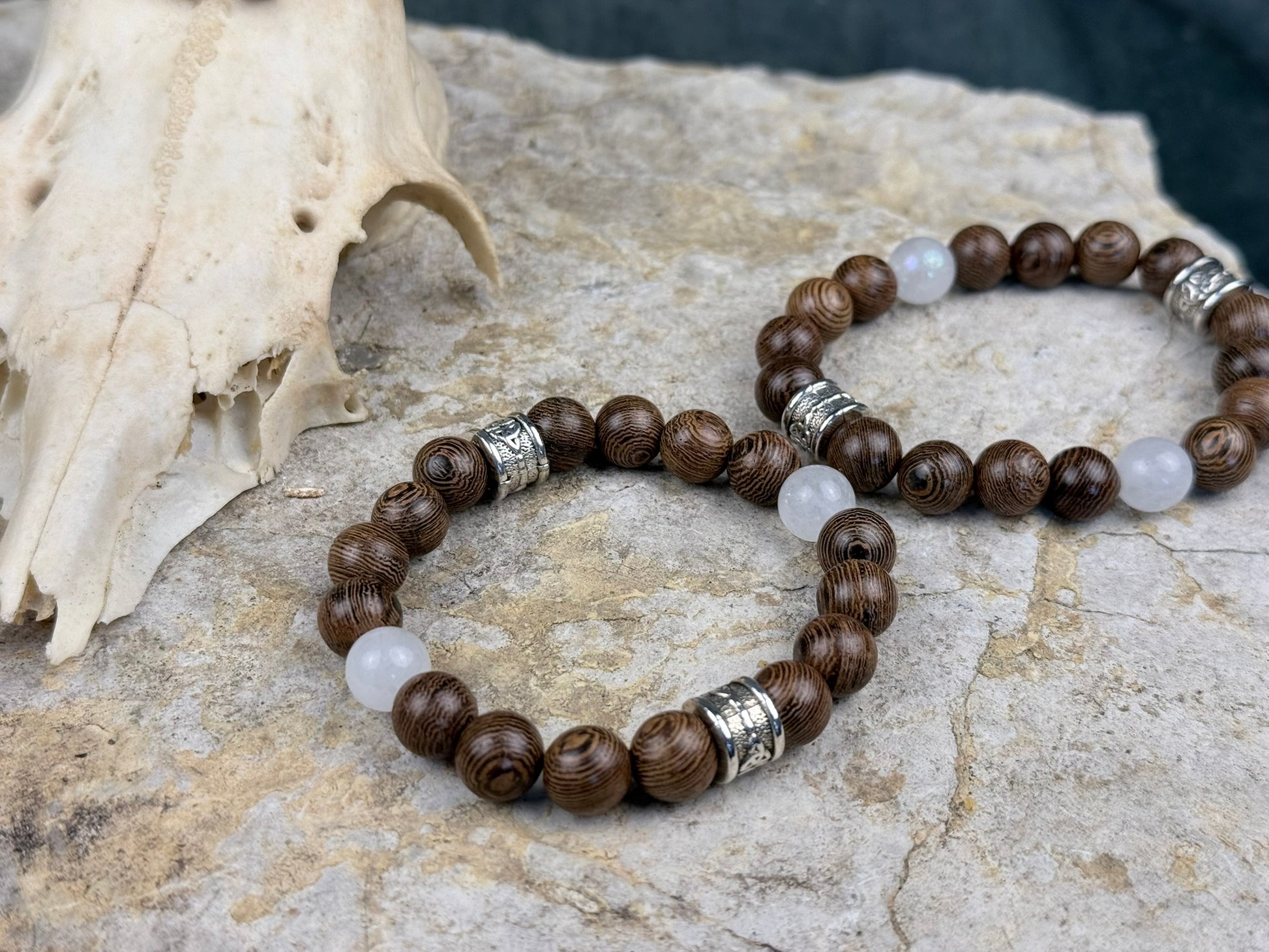 Herzholz & Mondlicht – Paararmbänder aus gemasertem Holz & Mondstein