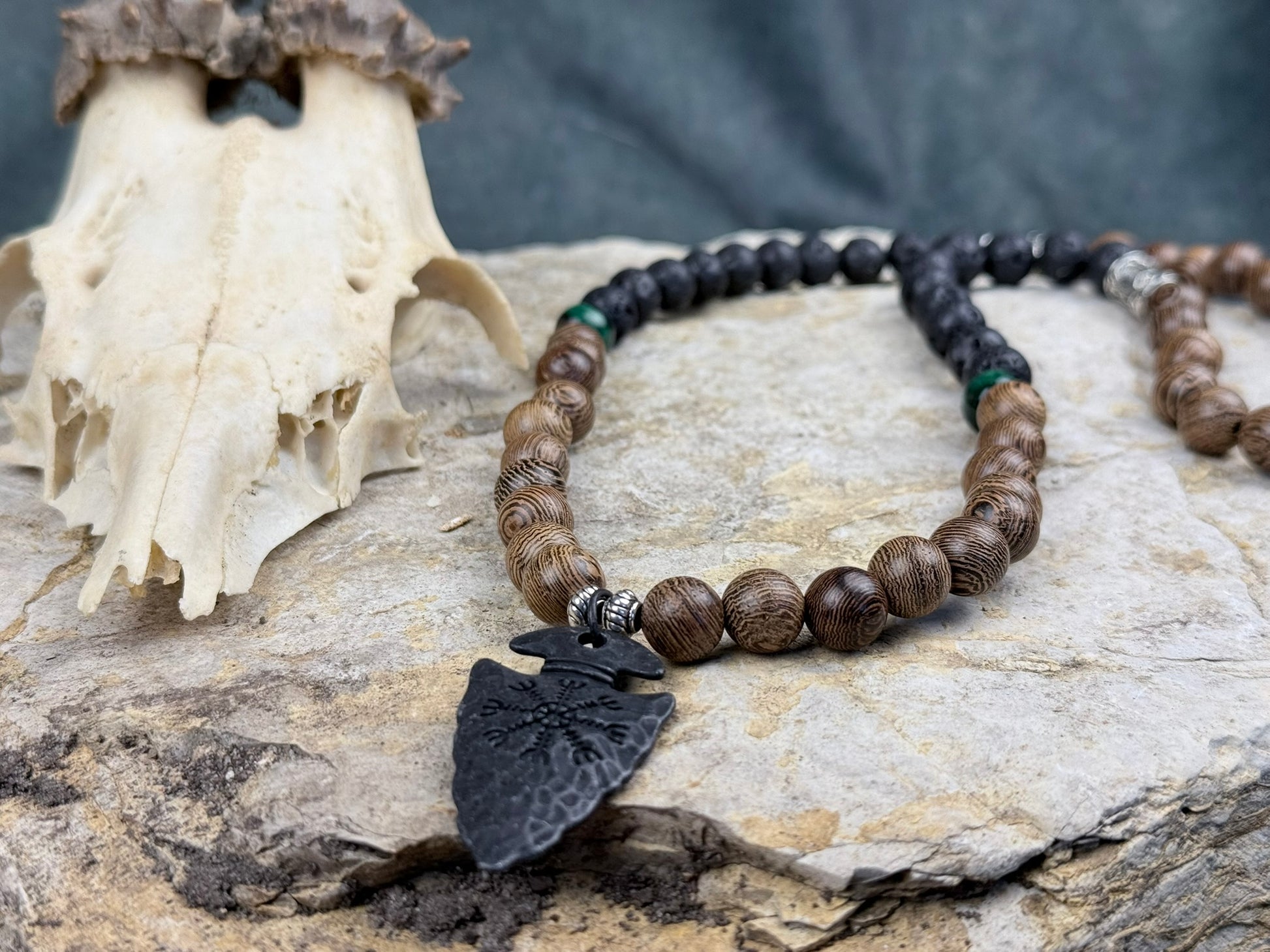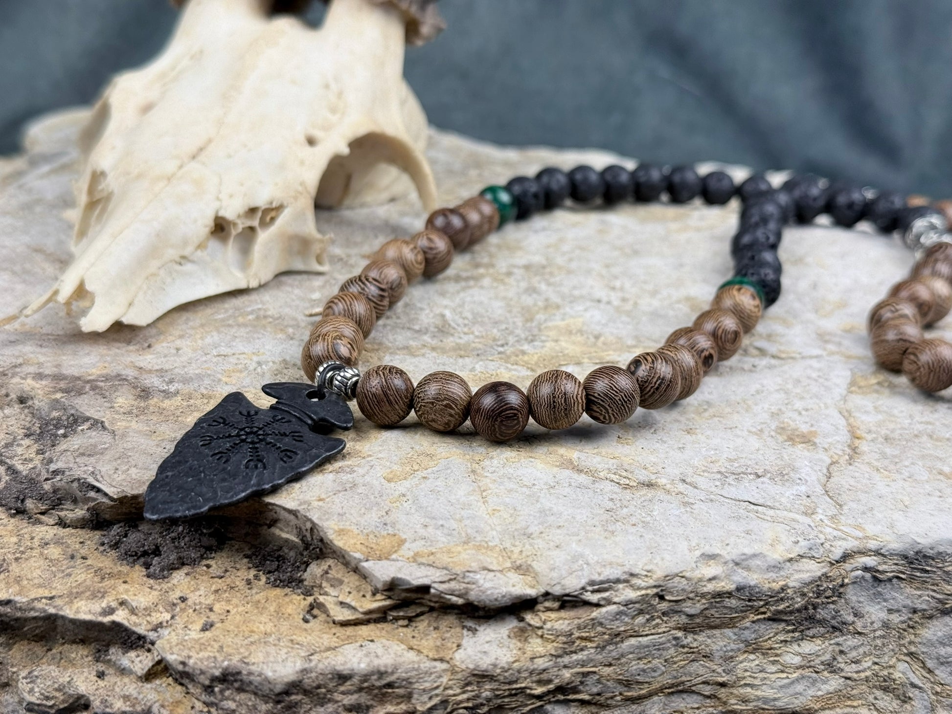 Drachenpfeil – Halskette mit Lavastein, grünem Tigerauge & schwarzer Pfeilspitze