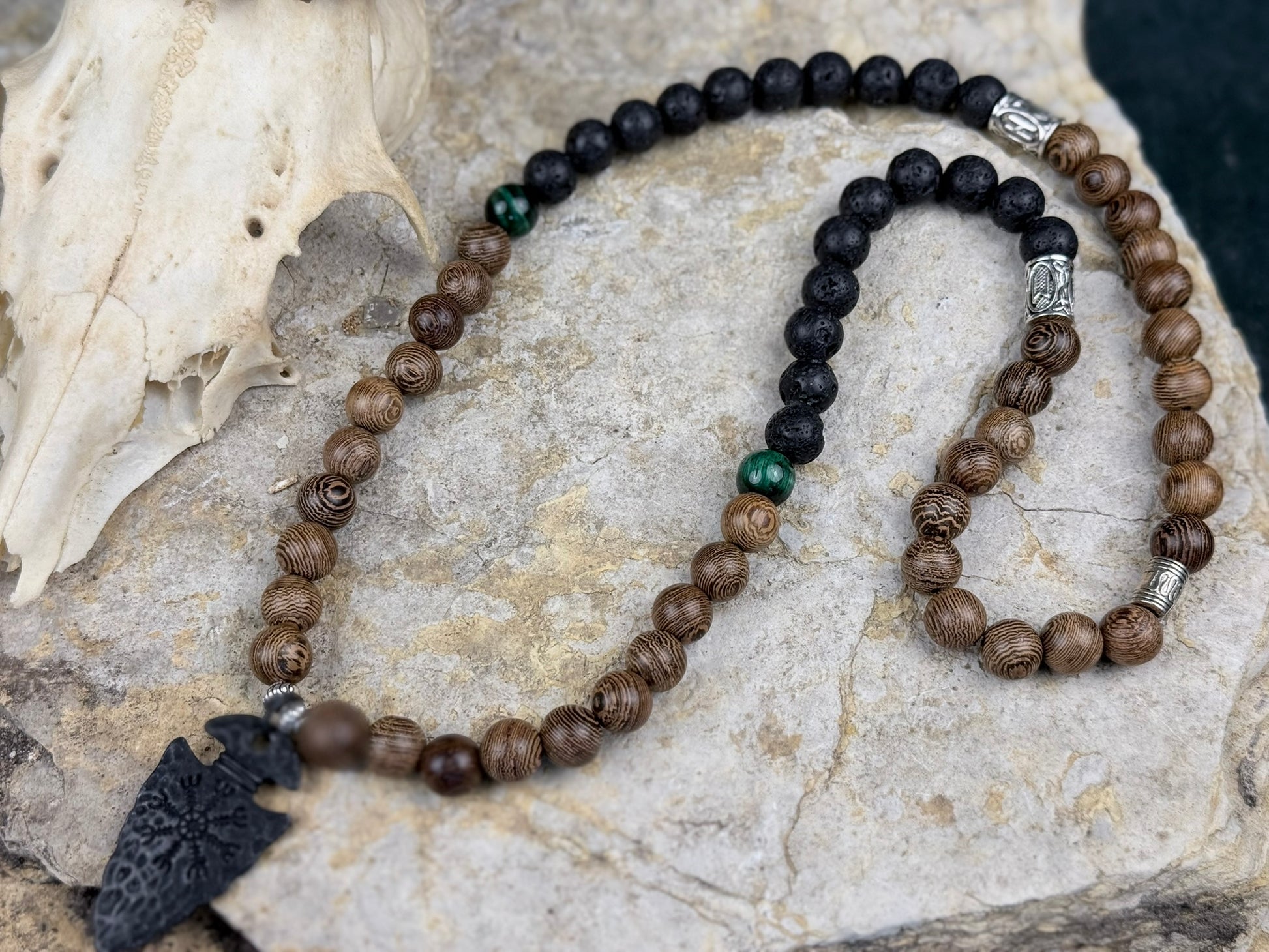 Eine markante Halskette, die die Energie des Drachensteins mit der urtümlichen Kraft des Lavasteins verbindet. Der schwarze Pfeilspitzen-Anhänger symbolisiert Stärke und Zielgerichtetheit, während grüne Tigerauge-Perlen und antikgoldene Zierelemente dem Schmuckstück eine mystische Tiefe verleihen.