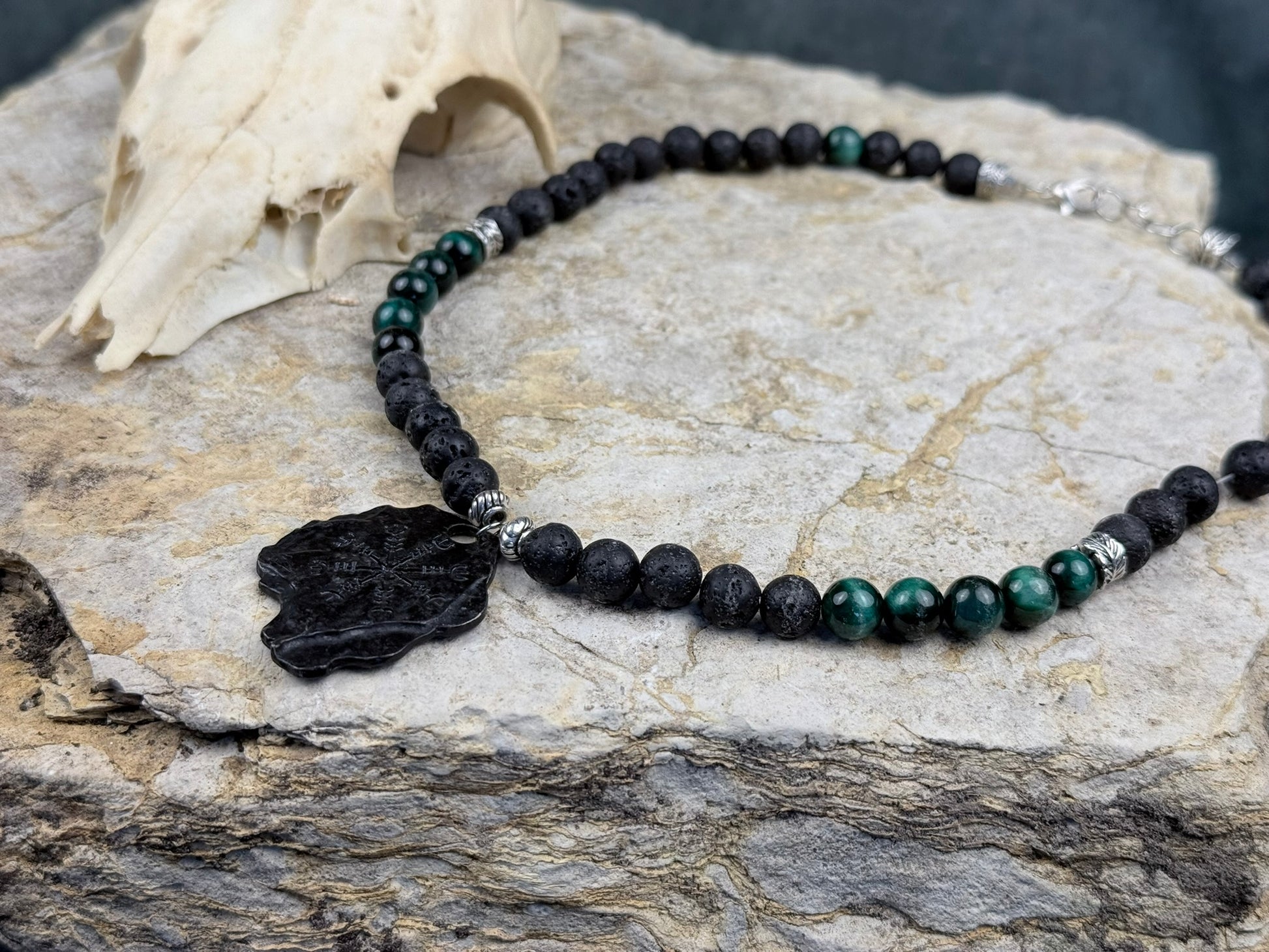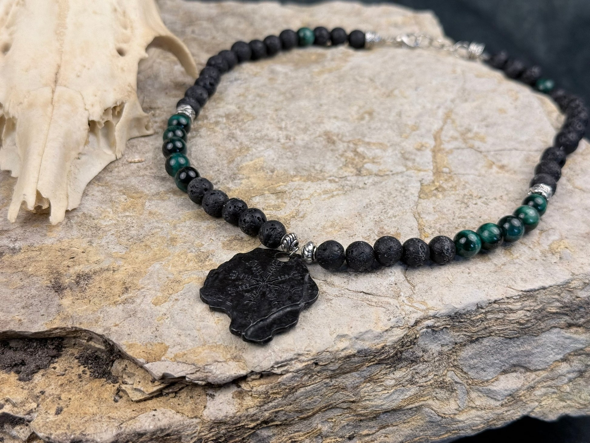 Nordpfad & Nachtgestein – Halskette mit Lavastein, grünem Tigerauge & Vegvisir-Anhänger
