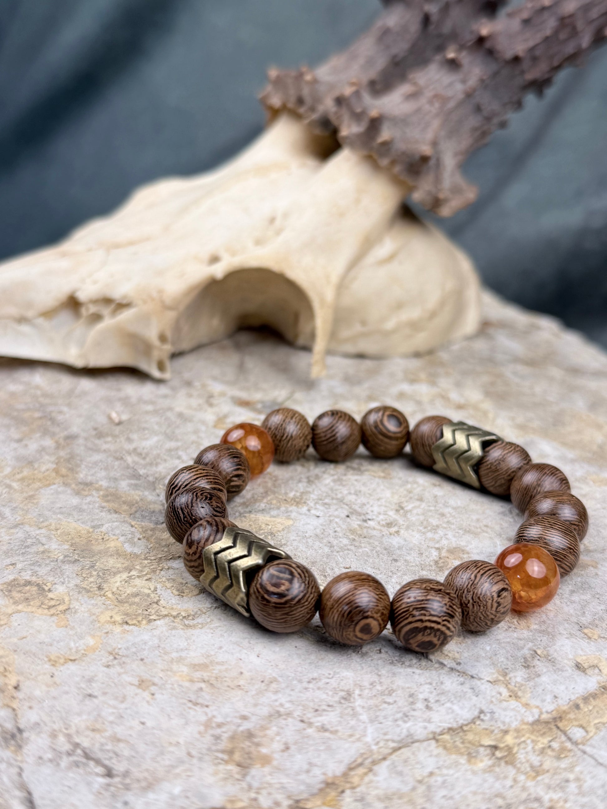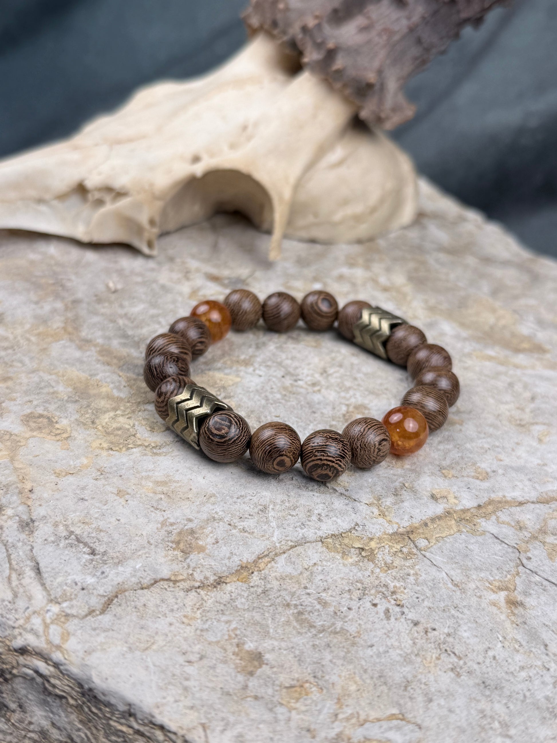 Dieses Armband wirkt wie ein Fundstück aus alten Zeiten – grob, erdig und voller Charakter. Der orangefarbene Drachenstein bricht das Licht wie glühende Glut zwischen verwittertem Holz und antik-goldenem Metall. Eine Kombination aus Natur und Feuer – für Handgelenke, die Geschichten erzählen.