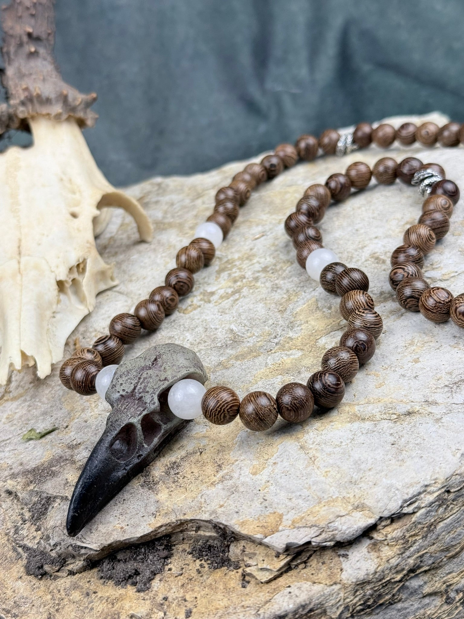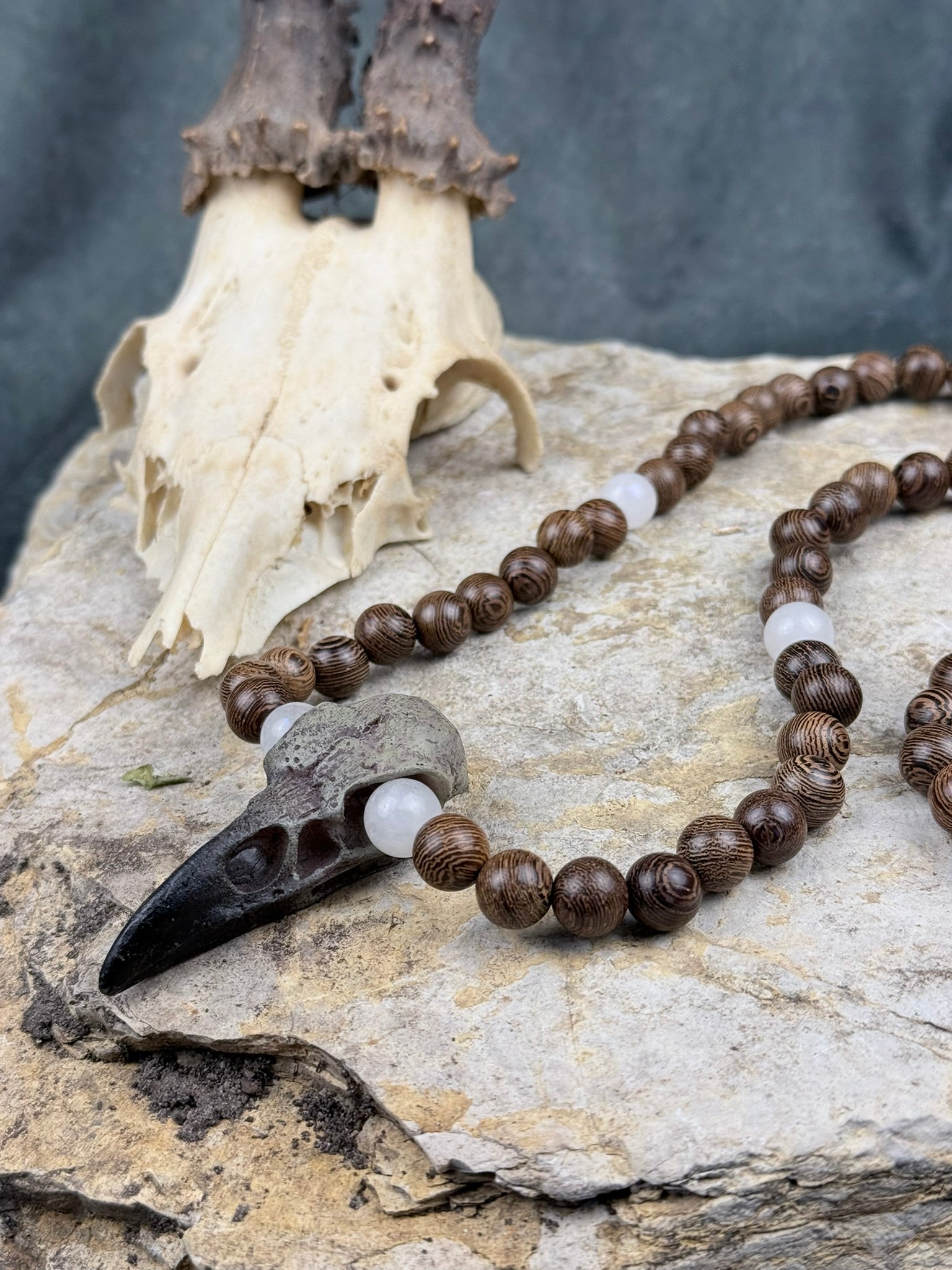 Rabenruf der Geisterpfade – Holzperlenkette mit Krähen-Schädelanhänger & Mondstein