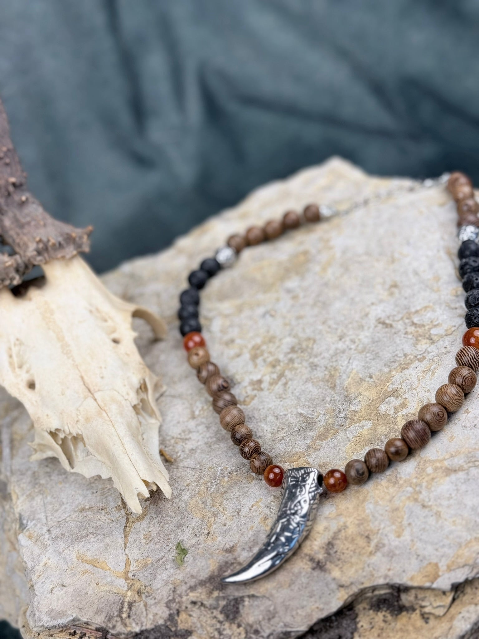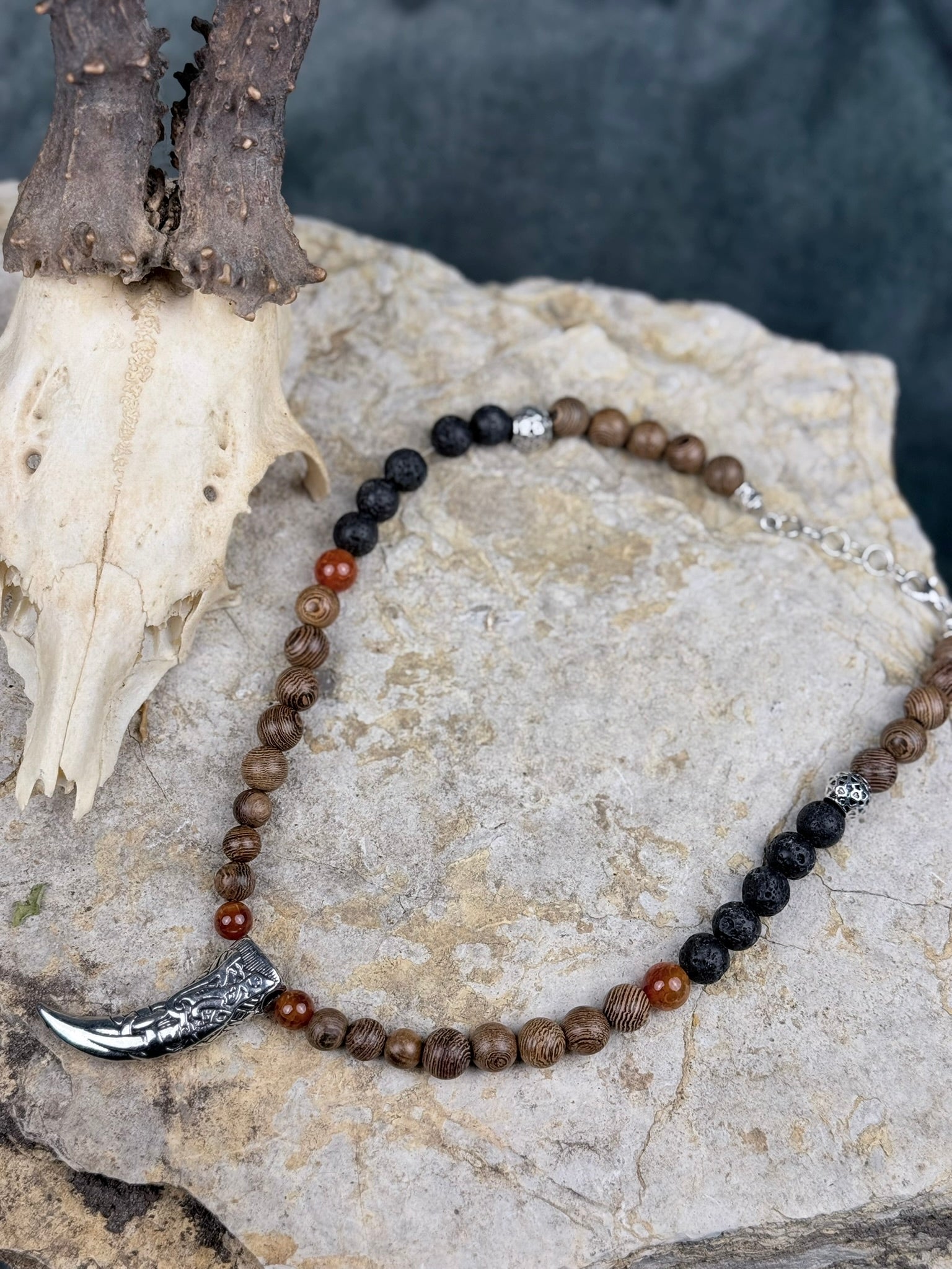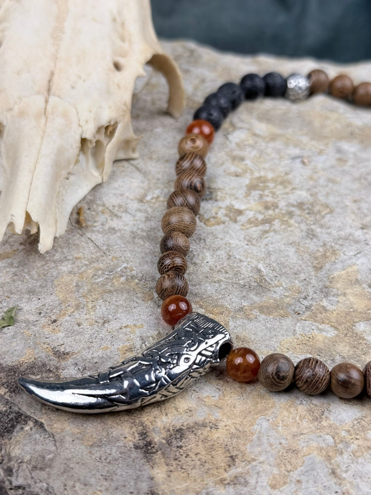 Dieses Schmuckstück trägt die Energie von Feuer, Erde und uralter Kraft in sich. Die Kette verbindet warm gemaserte Holzperlen mit leuchtenden Akzenten aus orangem Drachenstein – ein Zusammenspiel, das an Glut, Ritualfeuer und vergessene Mythen erinnert.