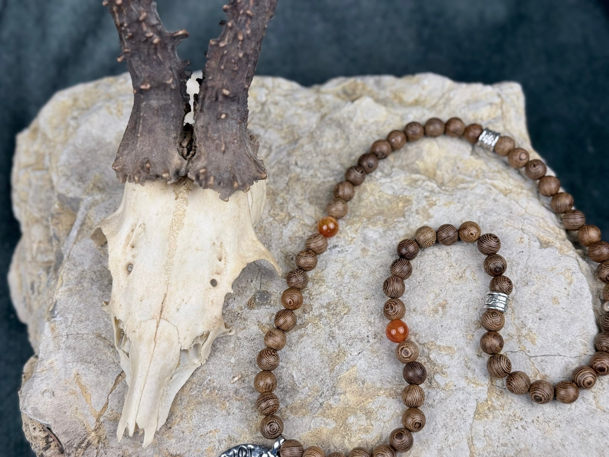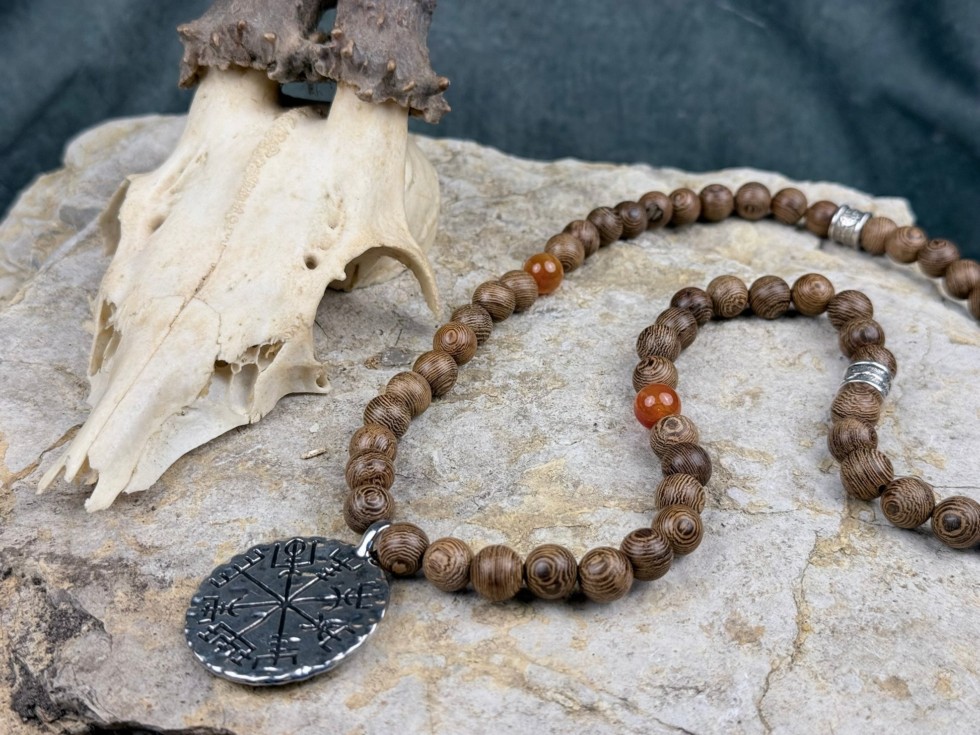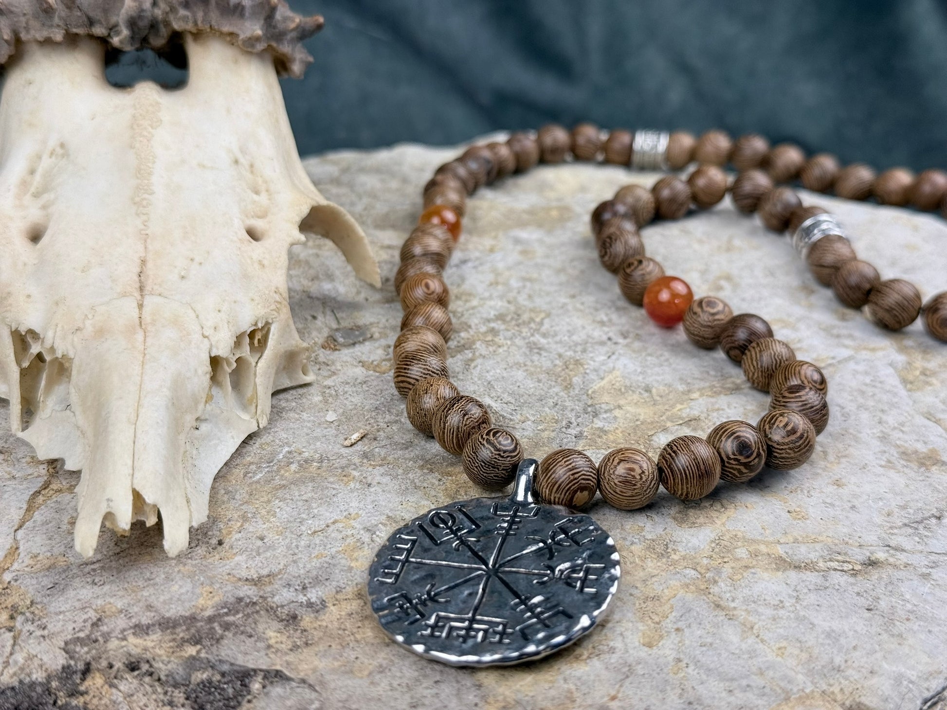Die Holzperlen zeigen eine einzigartige, natürliche Linienstruktur – jede einzelne wirkt wie eine kleine Scheibe aus einem uralten Stamm. Der orangefarbene Drachenstein setzt lebendige Akzente, warm wie Herbstlicht und glühende Lagerfeuer. Das ausdrucksstarke runde Amulett aus Metall verleiht der Kette ihren mystischen Charakter: schwer, antik im Look, wie ein Kompass, der nicht nach Norden zeigt, sondern dorthin, wo Abenteuer warten.