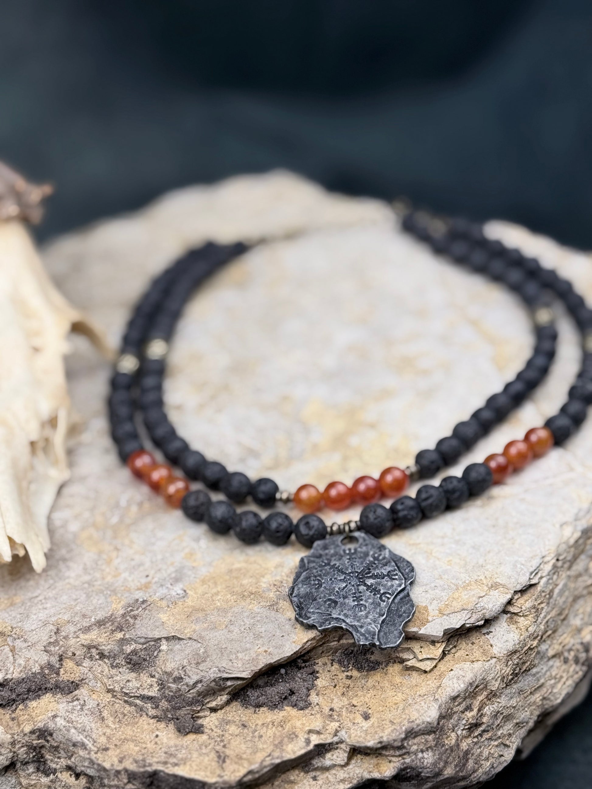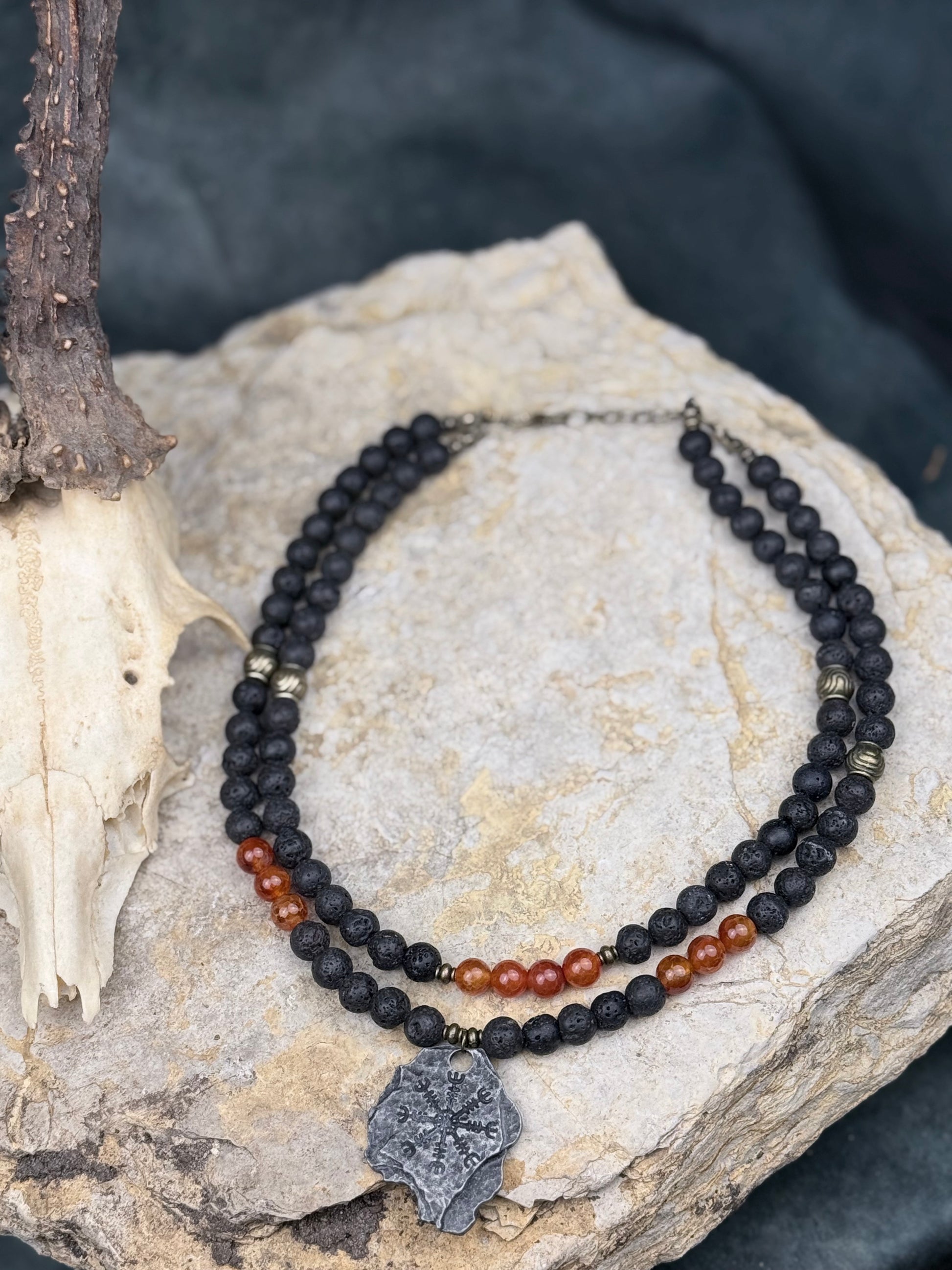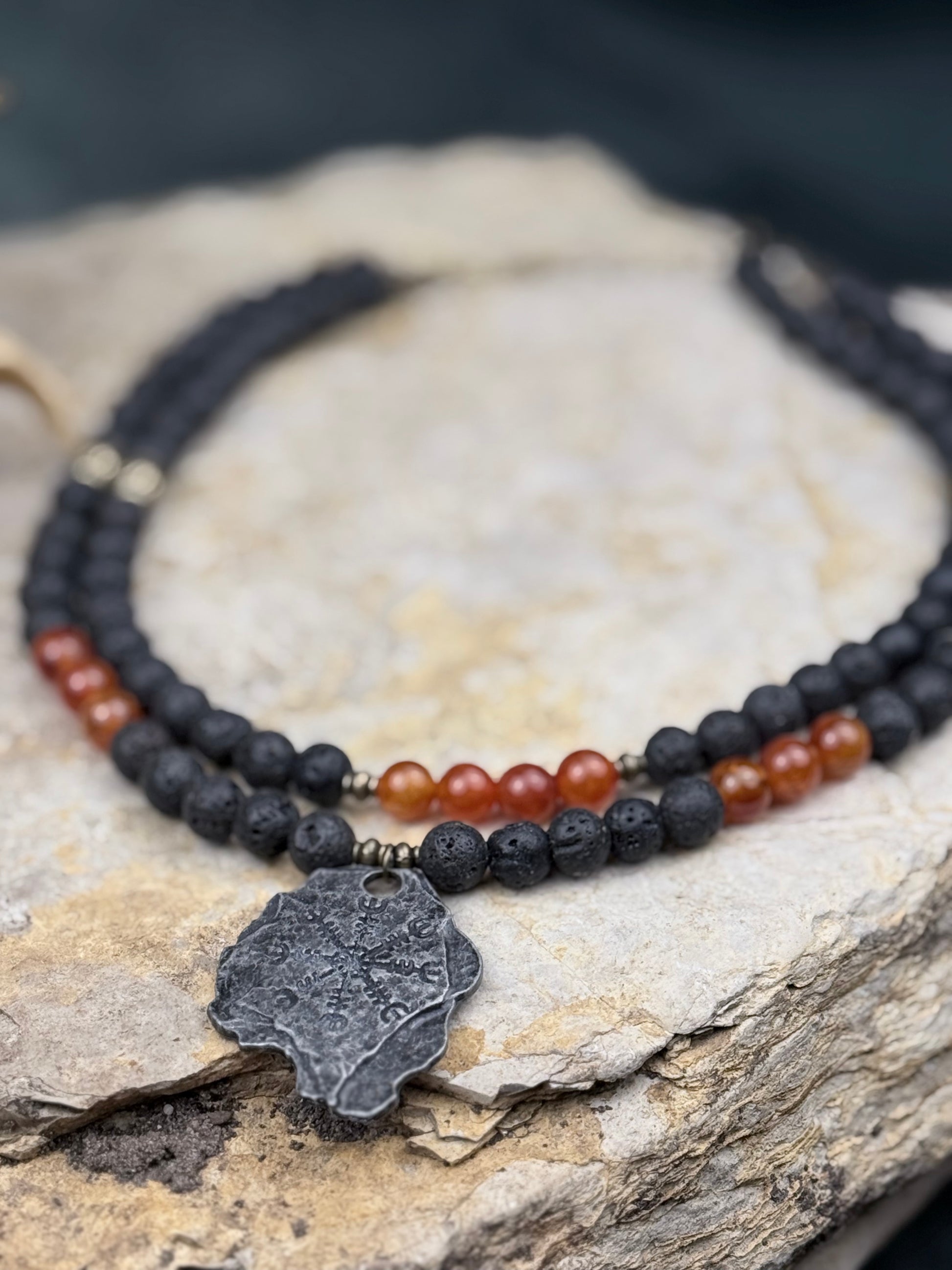 Diese markante Halskette verbindet die rohe Struktur von schwarzem Lavastein mit den warmen, erdigen Farbtönen von orangem Drachenstein. Das Design ist bewusst reduziert und kraftvoll gehalten – ideal für alle, die natürliche Materialien und einen ausdrucksstarken Look schätzen.