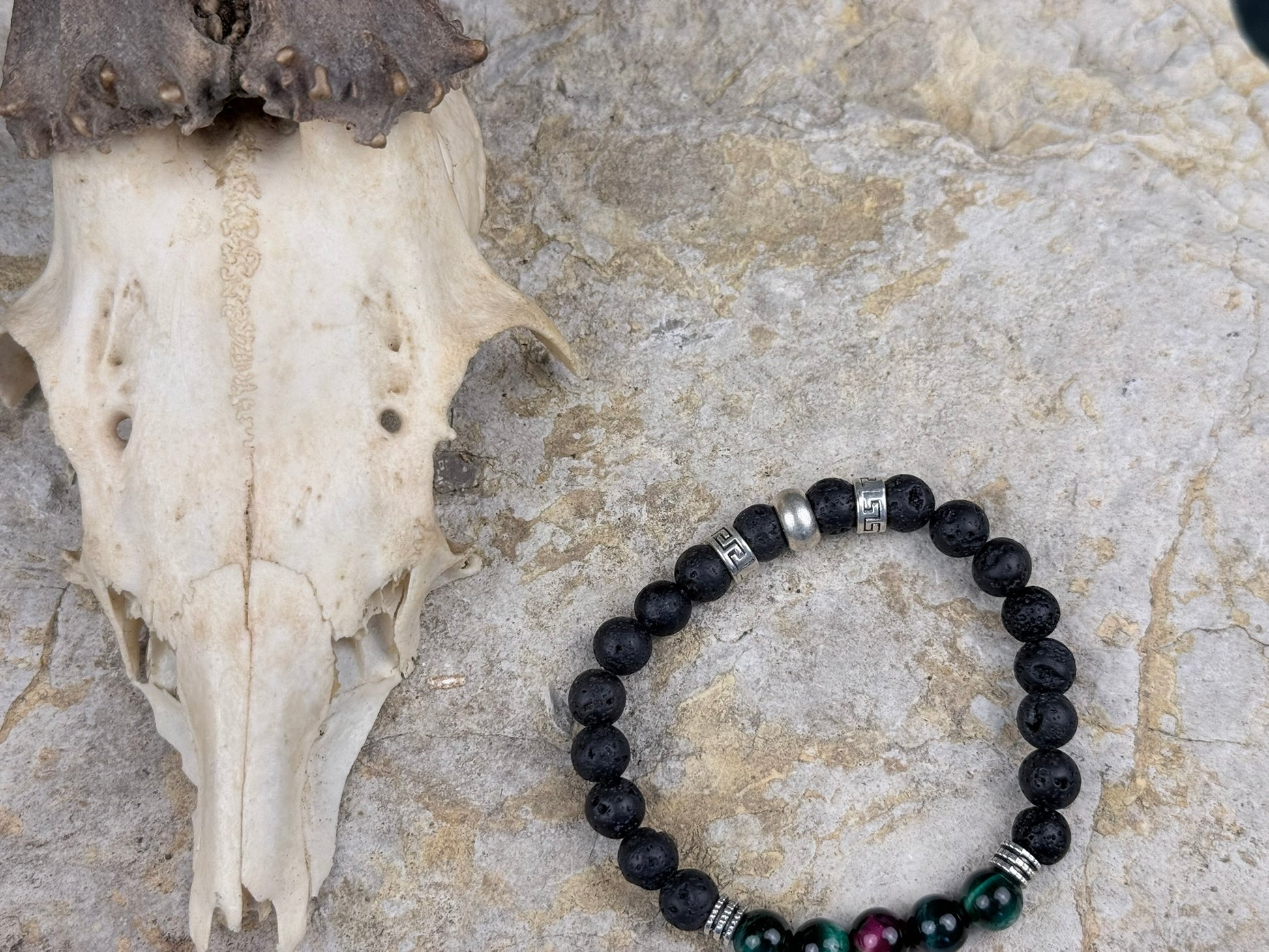 „Schwarzgrund & Waldglanz“ vereint die rauen, matten Oberflächen des Lavasteins mit dem tiefen, schimmernden Grün des Tigerauges.