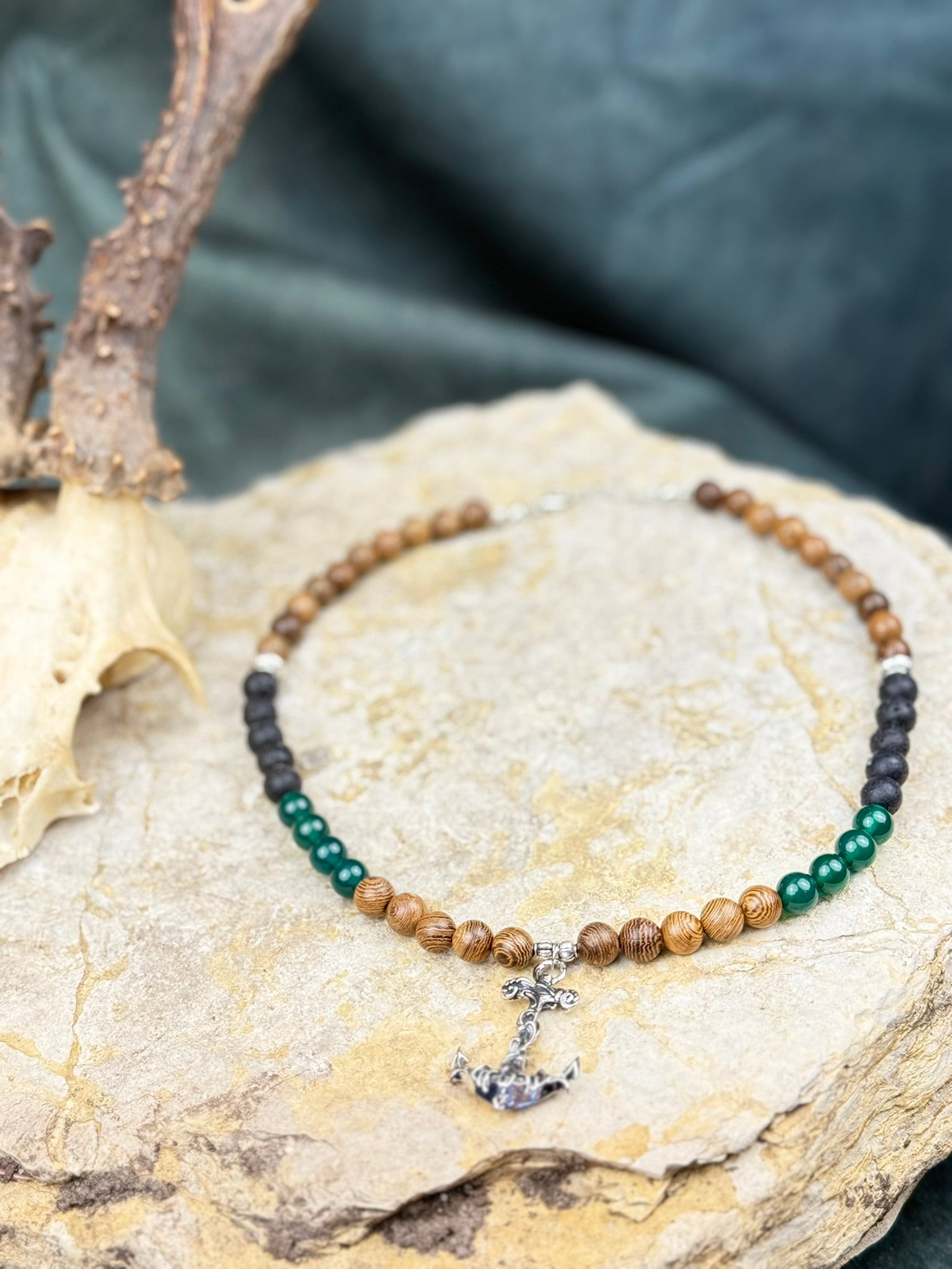 Diese Kette trägt den Geist rauer Küsten, salziger Winde und vergessener Seerouten in sich. Inspiriert von Piratenlegenden und der ungezähmten Kraft des Meeres verbindet sie dunklen Lavastein, warm gemaserte Holzperlen und tiefgrünen Achat zu einem Schmuckstück voller Abenteuer und Freiheit.