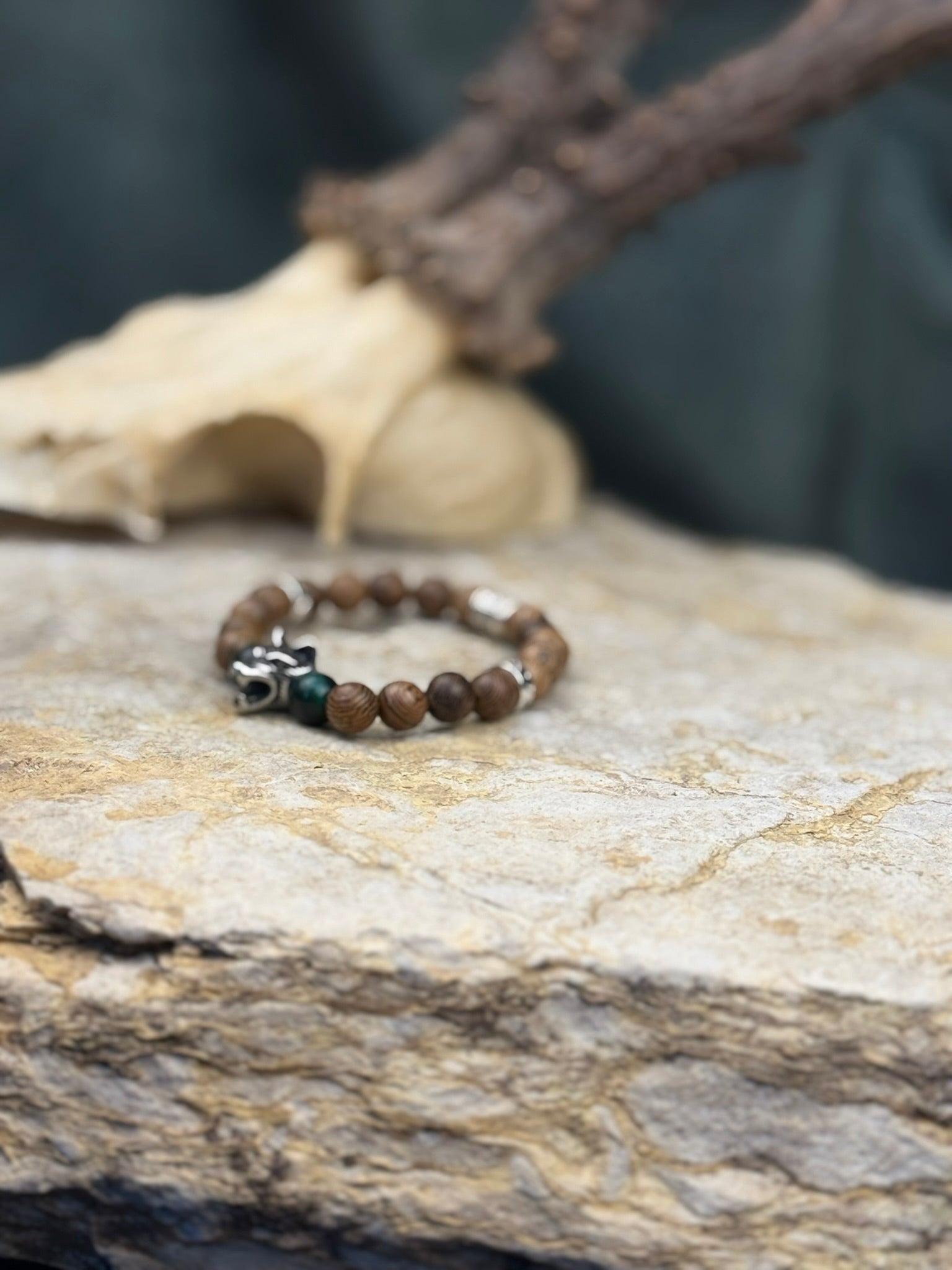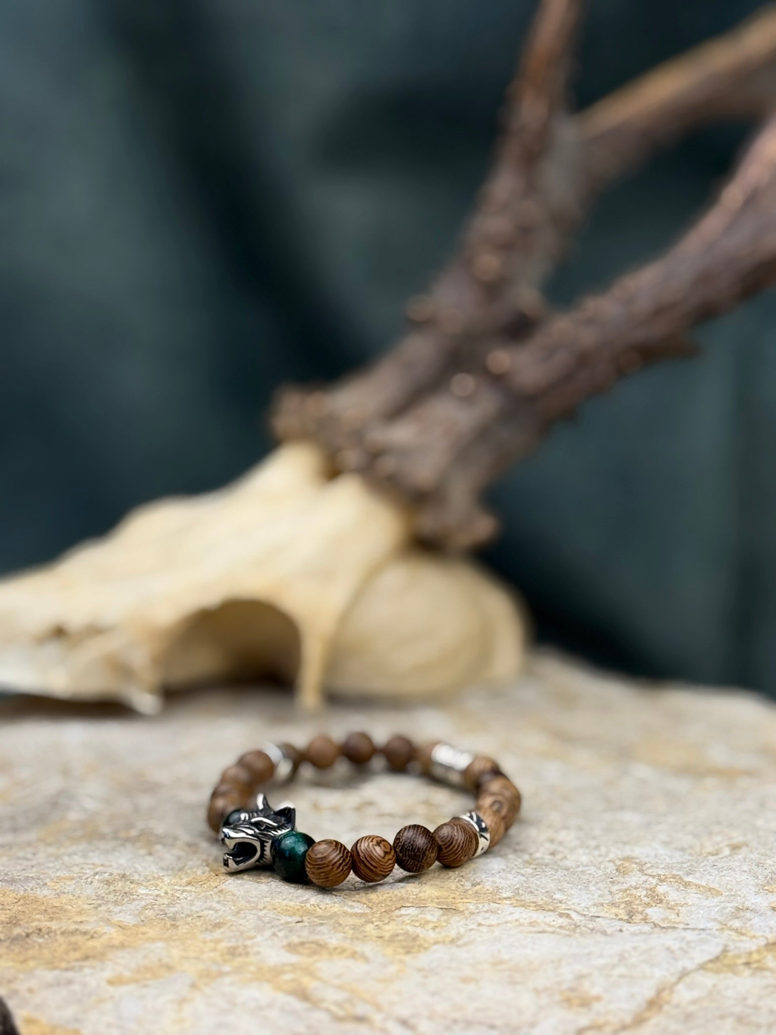 Dieses Schmuckstück trägt die Kraft unberührter Wälder, das leise Knacken von Ästen und den wachsamen Blick des Wolfs in sich. Das Armband verbindet warm gemaserte Holzperlen mit tiefgrünen Akzentsteinen und einem markanten Wolfskopf-Element – ein Zusammenspiel aus Naturverbundenheit, Instinkt und archaischer Stärke.