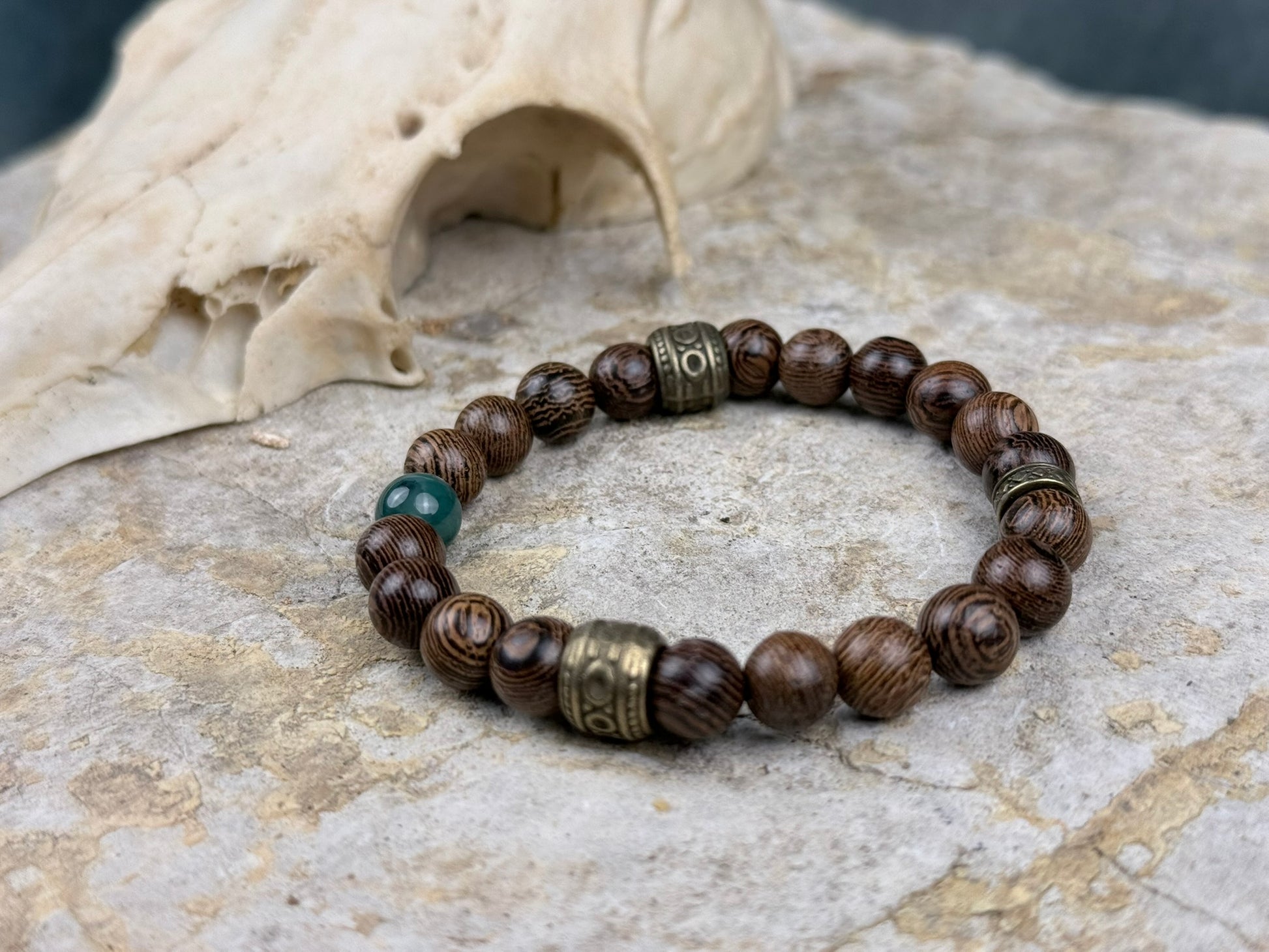 Ein einzelner Akzent aus grünem Drachenstein setzt bei beiden Armbändern einen klaren Farbfokus. Der Stein bringt mit seinem satten Grün und glatten Glanz einen feinen Kontrast zu den warmen Brauntönen der Holzperlen.